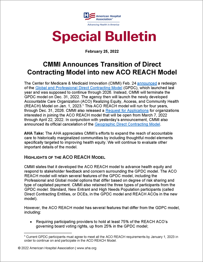 The AHA appreciates CMMI’s efforts to expand the reach of accountable care to historically marginalized communities by including thoughtful model elements specifically targeted to improving health equity. We will continue to evaluate other important details of the model.